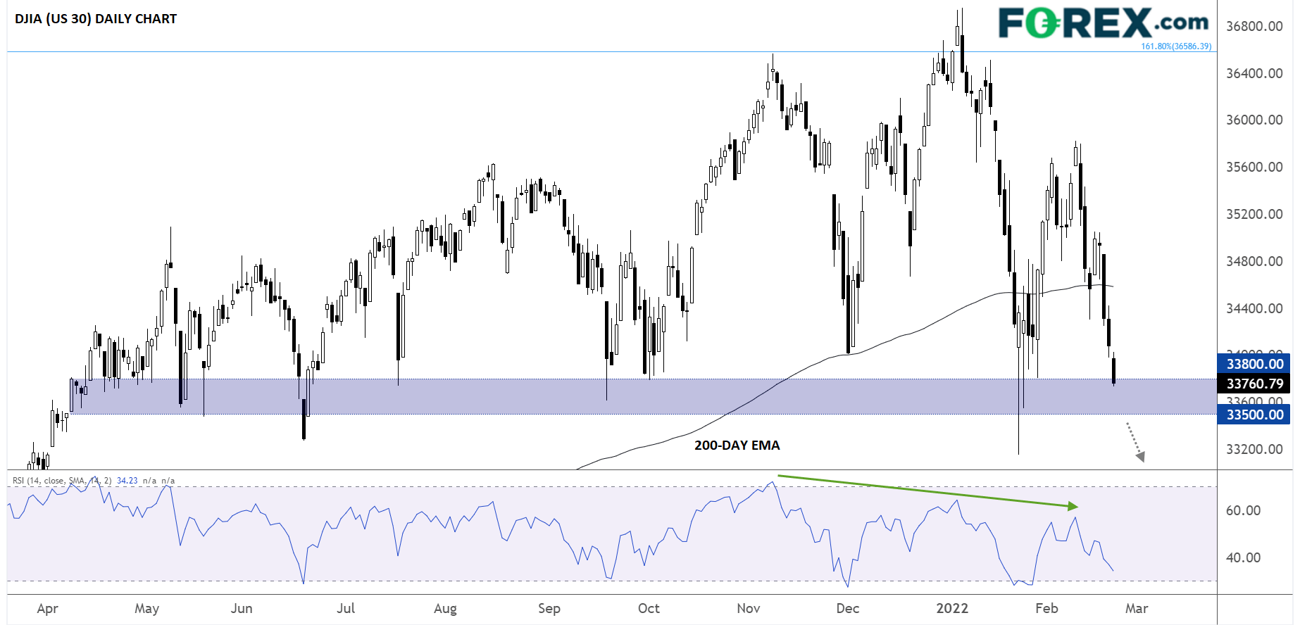 地缘政治局势的不确定性发酵,道指(美国30指数)不堪重负下挫。如下图所示,股指下破了200天指数移动均线,目前考验在过去10个月构成可靠支撑的33,500-33,800关键区域: