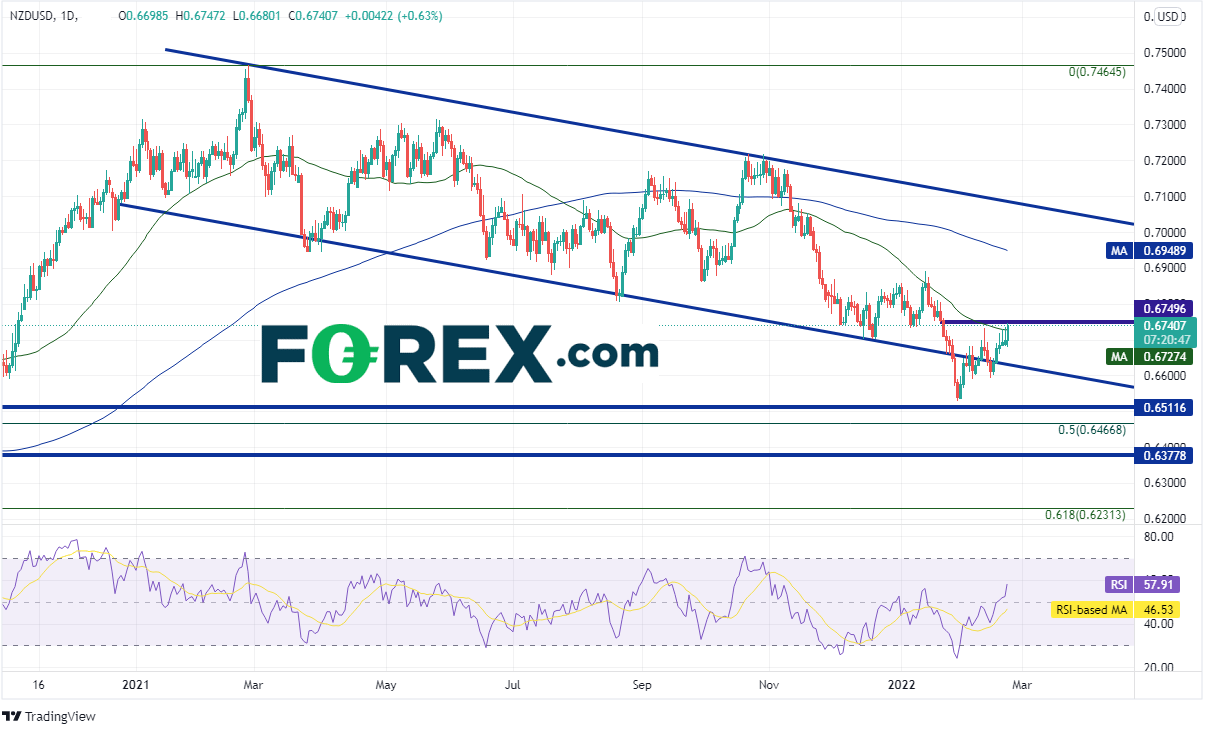 纽元/美元2021年年初以来一直交投于长达一年的下降通道内,今年1月底下破该通道的下轨趋势线,在0.6529创下短线低点后回到通道内,目前测试水平阻力位0.6749和50天均线0.6727附近。请注意,价格突破通道一端失败后常常回过头测试通道的另一端。