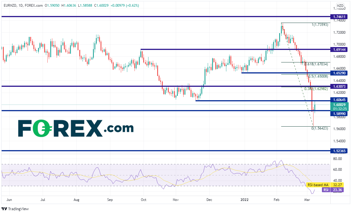 请注意,价格虽然走高,欧元/纽元的RSI和欧元/澳元的RSI一样仍处于超卖区域。如果RSI到达30,可为价格对当前跌势进行休整或反转提供更多支持力量。第一支撑位在昨天低点1.5642,第二支撑位在2017年7月低点1.5237附近。水平阻力位在今天高点1.6064,然后是水平阻力位兼2月4日高点下跌至昨天低点行情的38.2%回档位1.6300附近,接着是前述行情的50%回档位1.6500。