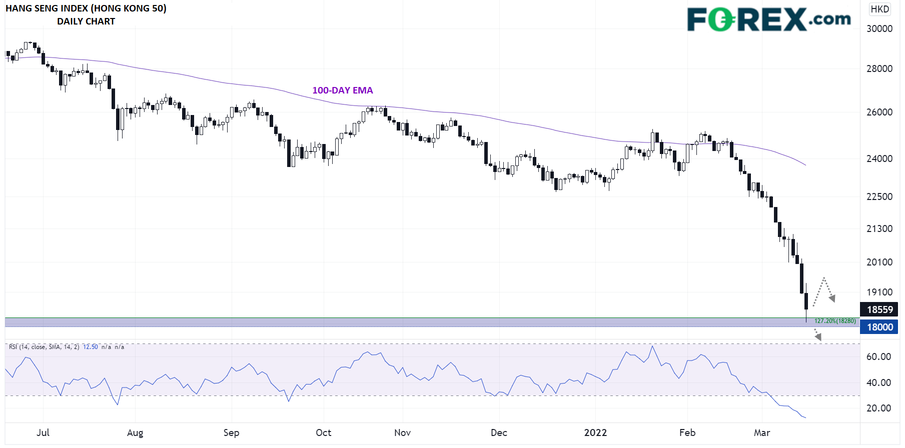 但只要监管、疫情、开发商与地缘政治风险这几个不利因素没有消失,目前来看恒生指数的任何回升都可能被交易者视为沽出良机。与此同时,有效下破18000区域的支撑位的话,可能打开延续下跌的空间,目标2011年低点16000区域。