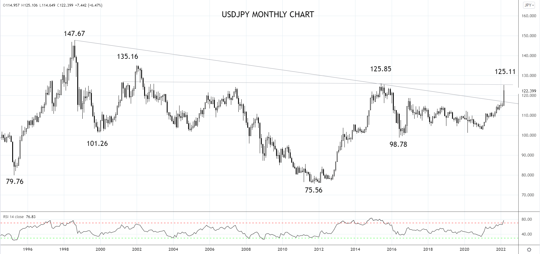 如果美元/日元持续站上126/127,可能表明新一轮涨势正在进行当中,目标2002年高点135.16,并有摸至1998年高点147.67的空间。而在展开可持续上涨之前,120.00应该可以构成力度不错的支撑。
