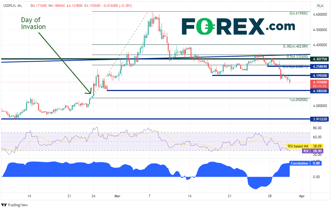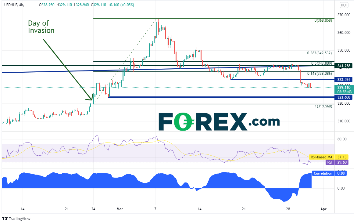 我们在3月初的讨论中指出,美元/卢布与部分东欧新兴市场货币对,比如美元/波兰兹罗提和美元/匈牙利福林之间有着高度相关性。过去2周美元/卢布和美元/波兰兹罗提4小时图相关性反复,但眼下相关系数达到+0.88。如果相关系数为+1.00,表明两种交易产品之间完美正相关,100%的时间里同向波动;如果系数超过+0.80,表明相关性高。美元/波兰兹罗提还没有完全触及入侵当天的突破位4.0505,其与当前价位构成水平支撑位,即4.1002。但请注意RSI业已进入30.00下方的超卖位,表明价格或准备回升。上方阻力在今天高点4.2020附近、水平阻力位4.2587、战争前创下的历史高点4.3078。