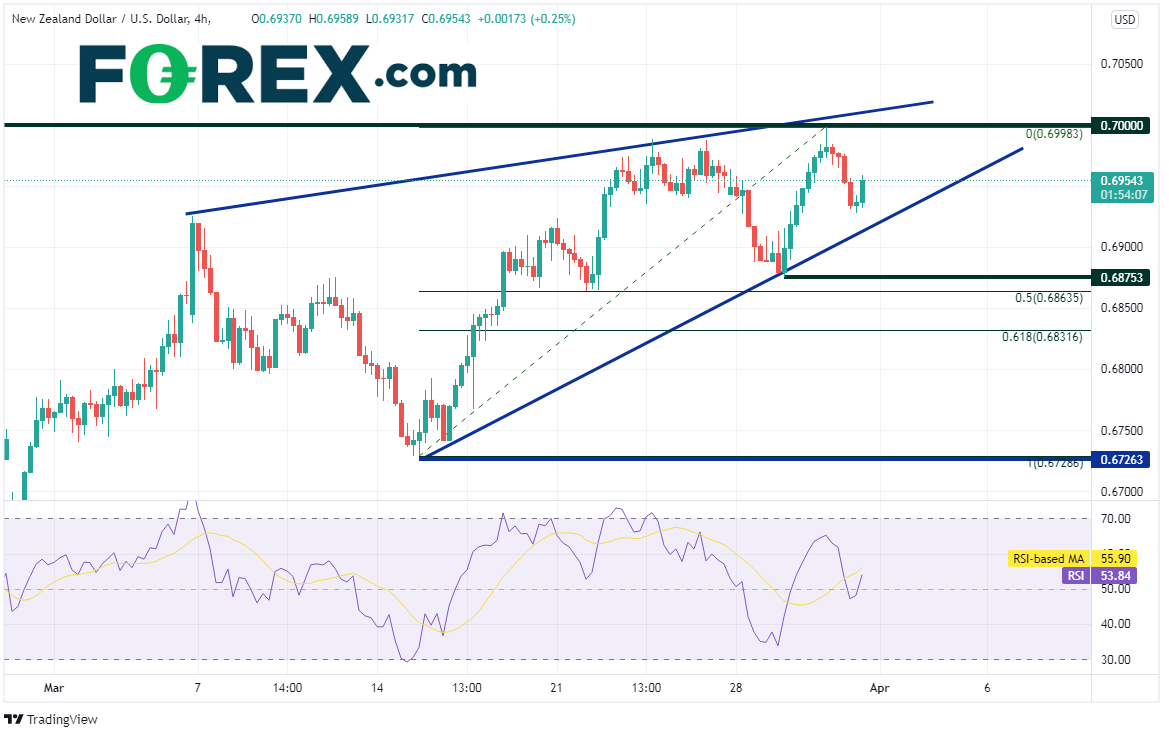 纽元/美元自2021年年初创下0.7465高点以来长期交投于下跌通道内,1月26日假性下破通道下轨,最低跌至0.6507,此后不断走高,目前交投于2021年10月29日高点到1月26日低点行情的61.8%回档位0.6950附近。昨天价格一度摸至0.7000的整数心理阻力关口,今天则回撤。长期通道的上轨趋势线落在0.7045附近之上不远处,构成后市阻力。如果站于其上,可能上看0.7073的水平阻力位,站上后者,则打开上涨空间,目标2021年10月29日高点0.7224。