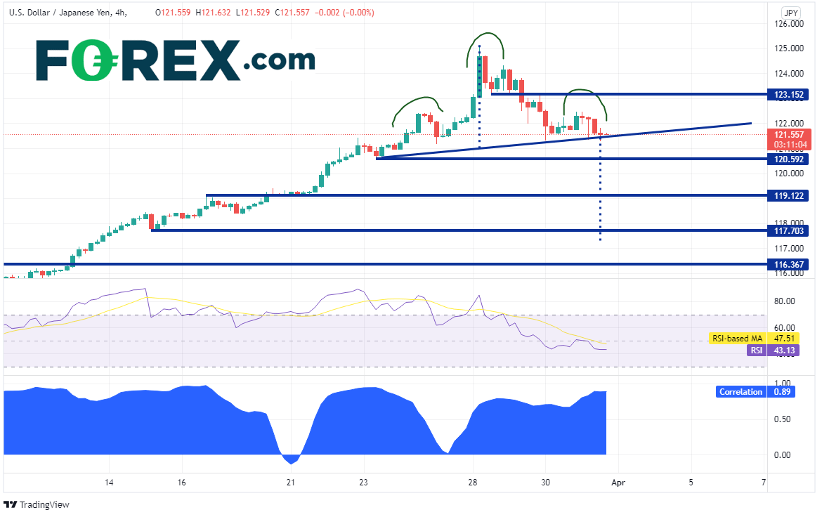 通胀近期的上升(部分源自俄乌战争)和强硬美联储立场不断推高美国10年期国债收益率,而其与美元/日元之间具有高度相关性,后者因此随之走高。然而,两者双双有所回落,其中美元/日元正在构建潜在头肩顶形态。请留意该货币对是否突破颈线,如果突破,两者可能一起迅速走低。