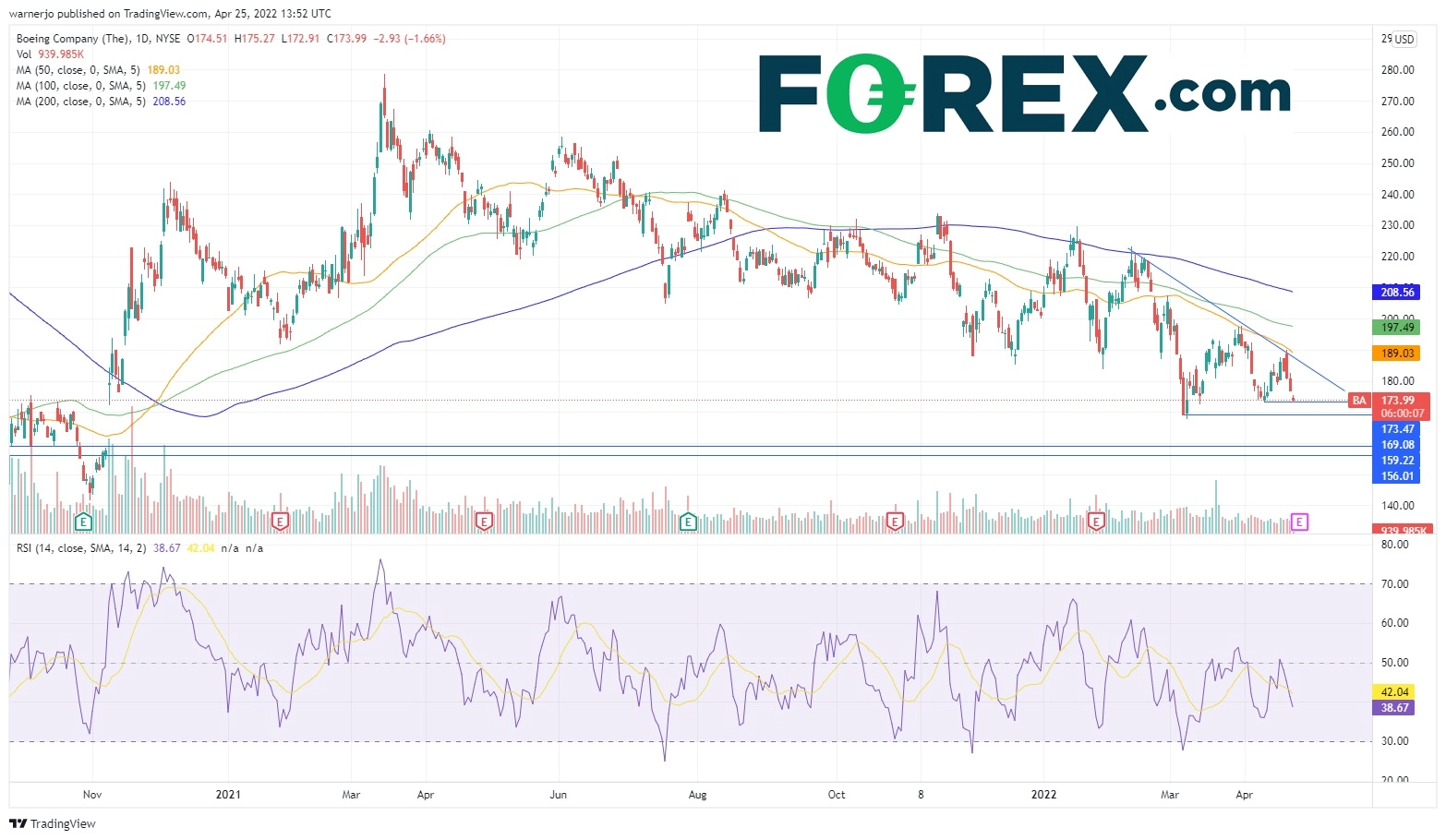 成交量在过去100天持续缩减,该股很可能继续推低,但仍处在介于上一阶段高点190美元和(若173美元失守)2022年低点169美元之间通道内部。RSI看跌信号支持上述假设。若下穿通道则可能探向156美元,而若升穿跌势,股价有望锁定50均线目标189美元,100天均线197美元,然后是209美元200天均线。