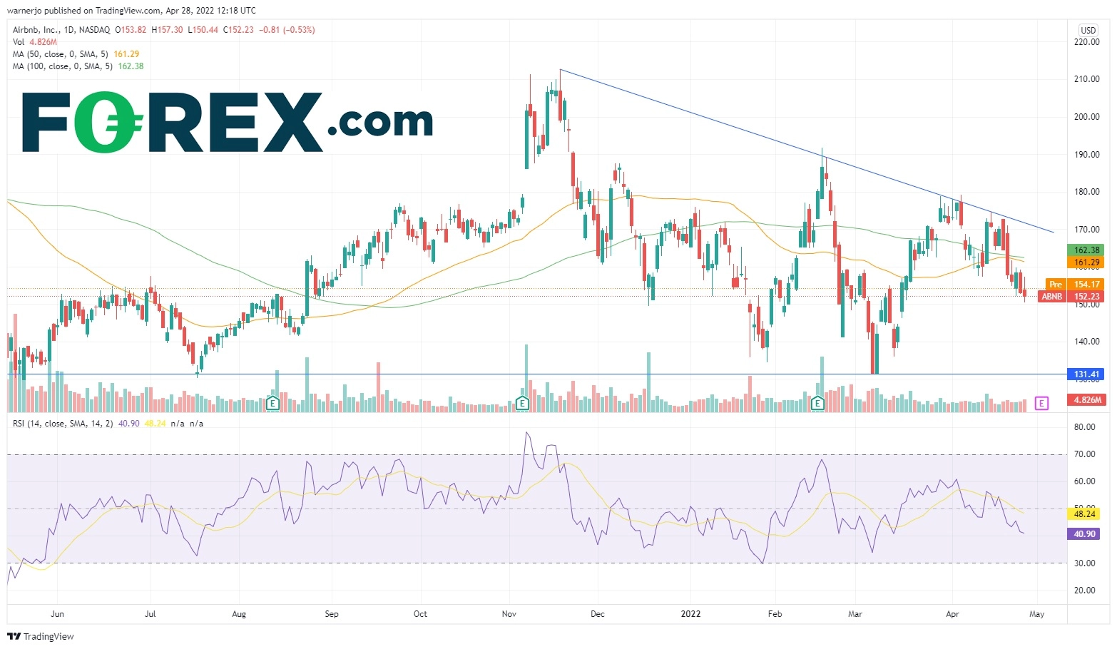 如果跌势继续,股价或探入2022年3月和2021年7月两度触及的131美元支撑位下方。RSI看跌,表明股价短线或进一步承压,不过近期交易量有所减少,表明下跌趋势或已丧失动能。