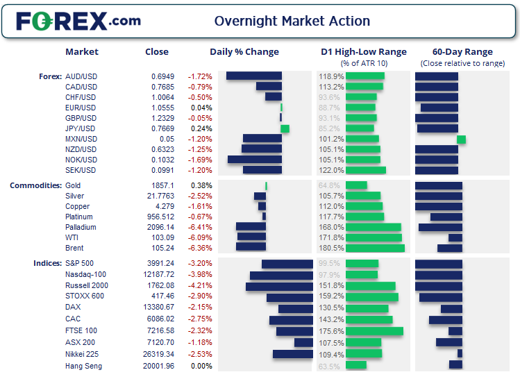 标普500指数14个月中首度收于4000下方,所有板块承压下挫,能源板块领跌,85%的个股走弱。纳斯达克100指数收于关键支撑位下方,跌至2020年11月以来最低点。