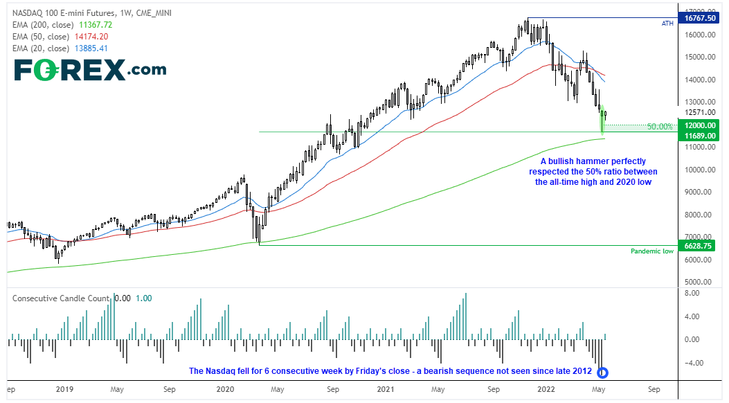 截至周五收盘价,纳斯达克100指数连跌6周 – 2012年年底以来历时最长的一次连跌,但在2020年3月低点到历史高点行情的50%回档位上方构筑看涨锤子形态,也守住了200周指数移动均线。所以,我们高度怀疑现在应进入回归均值阶段。