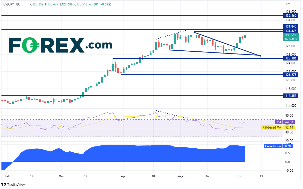 美元/日元日图一直和美国10年期国债收益率同步上涨, 于5月9日在131.34形成最新高点,两者目前的相关系数为+0.92。相关系数高于+0.80即被视为关联度高。美元/日元之后回撤,形成下降楔形,RSI也在超买区域开始和价格背离。货币对在5月24日最低到达126.36,后于周二再度开始走高并打破了下降楔形形态。该形态突破后的目标为100%回档位,此例中在131.34。