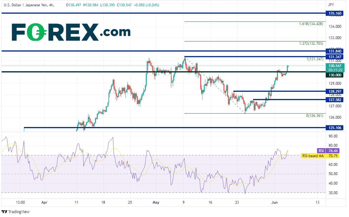 美元/日元4小时图一度止步于130.00的心理整数位,但在非农就业报告公布后恢复涨势,和美国债券收益率一起走高。上档第一阻力在5月9日高点131.24,如果攻克,可能上看2002年以来的水平阻力位131.84、5月9日高点到5月24日低点行情的127.2%扩展位,即132.70附近。但请注意,RSI再度进入超买区域,暗示价格或准备修正。如果美元/日元回撤,下方第一支撑位在130.00心理整数关口,失守的话可能跌至128.30水平支撑位,然后下看127.58的水平支撑位。