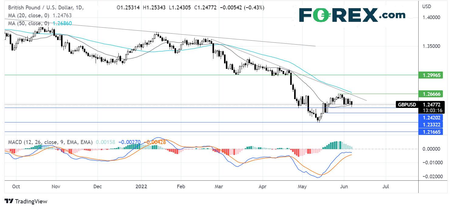 期间支撑位可见于20期均线1.2475,并且目前正在考验该位。如果下破该位及4月低点1.2420,后市或先后下看5月19日低点1.2340和1.2150。