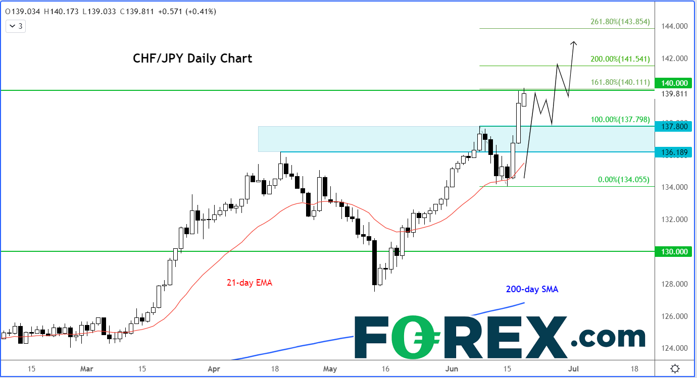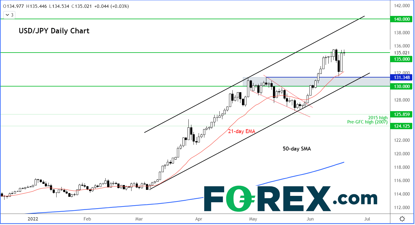 如上所述,美联储不断透露强硬立场。美联储仍是主要央行中立场最积极的一家,这点应可约束美元的下行空间,特别是美元兑那些央行立场依然温和的货币,即日元。日本央行上周按兵不动,美元/日元随后收复135整数位,蓄势上攻140的动能保持不变,途中没有任何明显的阻力:
