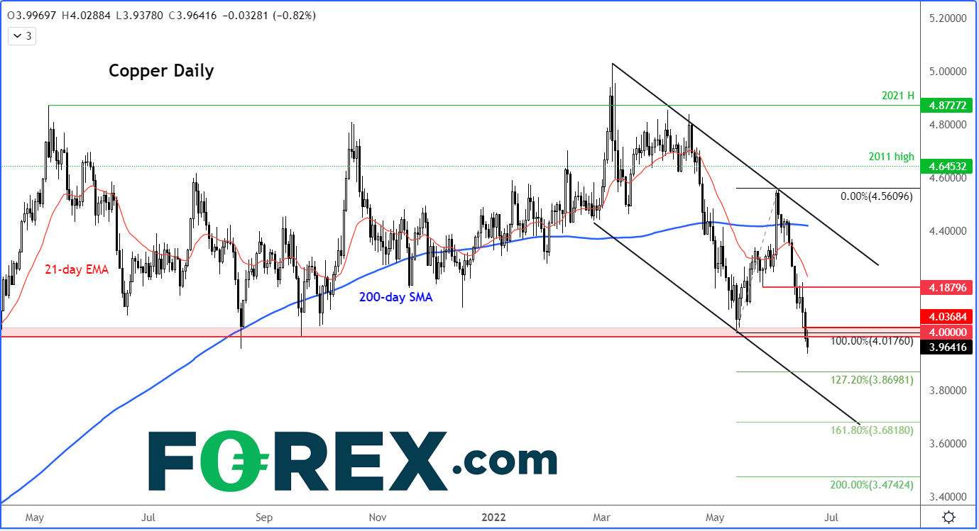 铜继续处于看跌通道内,我们仍预计上行将受制于阻力,铜价将下破支撑。图表上显示的斐波那契扩展位可能是下个看空目标。