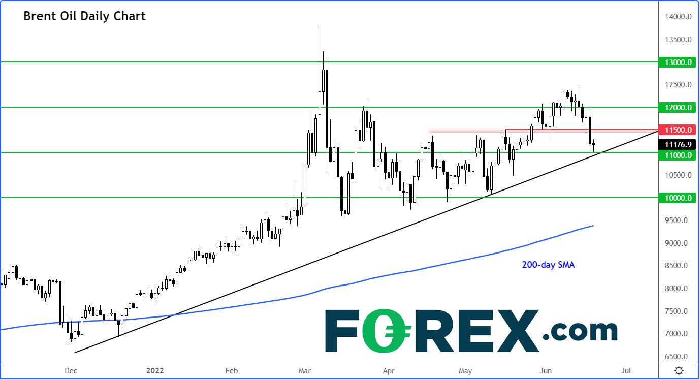 因此,油价若自此小幅反弹或也不算意外。但如果趋势线告破,油价可能大跌,探向105美元,然后是100美元。