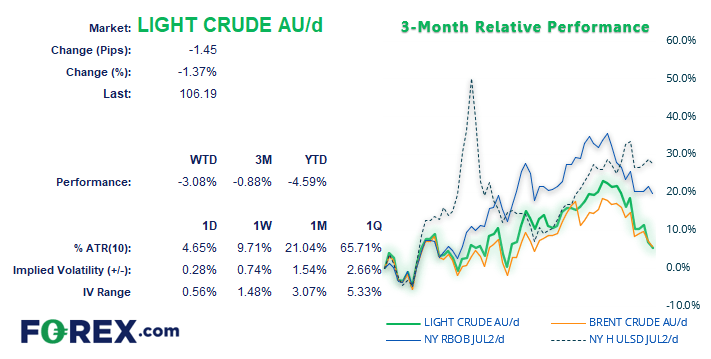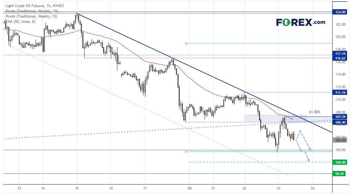 WTI期货昨天探至1个月低点,尽管收盘时有所回升,但今天亚盘再度推低。2021年12月趋势线附近走势不太果断,市场需要就升穿还是下破做出决定。但1小时线图交投于构筑一系列高点降低的看跌通道内,至少目前看来,价格安于呆在106.40-107.30阻力区下方。看跌吞没K线正在试图成形,因此,若美元重拾上行,油价或重新测试102美元附近支撑位,若失守,下看100美元。