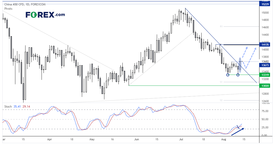 中国A50指数突破日图下降趋势线,暗示趋势转变。周三以看涨锤子形态在13,319构筑双底,后形成大阳线收上趋势线并探入13,679波段高点。随机震荡指标同样发出买入信号,目前追随价格上涨并脱离超卖区域。守住13,319继续看涨,亦可以趋势线辅助管理风险。现在我们认为,股指有潜力反击14,000,甚至月图枢轴位附近的14,135高点。