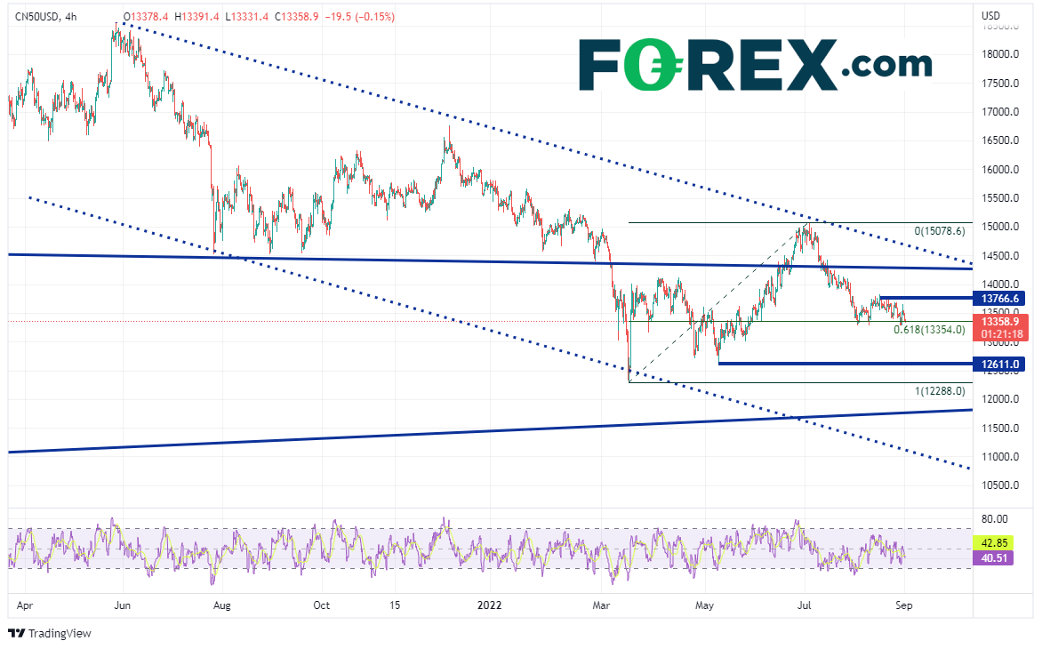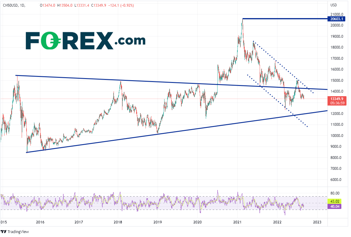 中国最近传出的消息都不大乐观。8月财新制造业PMI报在5月以来最低点49.5,低于50的荣枯分水岭,而预期值和前值分别为50.2和50.4。这次读数低于预期的主要原因有:停电、疫情反复下经济活动的中断与重启。疫情方面,中国第四大城市、占国内GDP1.75%的成都市静默四天,而中国最大的科技中心深圳也有多个区域封锁。雪上加霜的是,美国已下令英伟达与AMD暂停向中国与俄罗斯售卖AI芯片。而这一切都发生在包括工业增加值和社会消费品零售总额在内的糟糕经济数据发布之后。另外,由于开发商不断破产,中国地产业遭遇滑坡。中国A50指数逼近其5月低点,后市能够反弹吗?