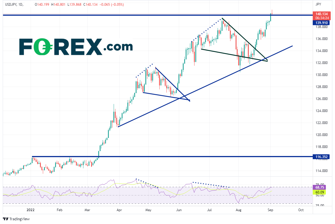 美元/日元继3月11日站上水平阻力位116.35以来不断走高,在通胀继续上升且美联储必须大举加息的事实明朗之后,涨势贯穿春夏两季。美元/日元两次创下趋势新高后修正并形成下降楔形,都在价格逼近楔形尖端时突破并延续涨势,收复100%的楔形。美元/日元周四创下1998年8月以来最高点140.23,周五继续冲高,创下140.80新高。但美元在非农就业报告公布后涌现的获利回吐盘带动下开始回落,如果基本收平于140.20附近,货币对或形成射日之星形态,那是预示后市可能修正的形态。