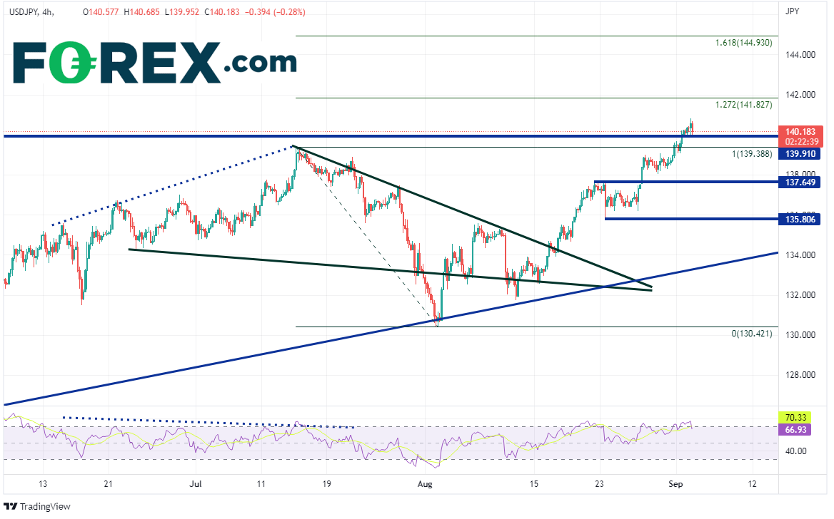 美元/日元4小时图不断创下新高,找阻力位的工作困难重重。第一阻力在周五高点140.80,攻克的话可能上看7月14日高点到8月2日低点行情的127.2%和161.8%扩展位,分别落在141.83和144.93。如果受制于周五高点且展开修正,下档可能先后下看7月14日高点139.39、水平支撑位137.65和8月23日以来的下影线低点135.81。