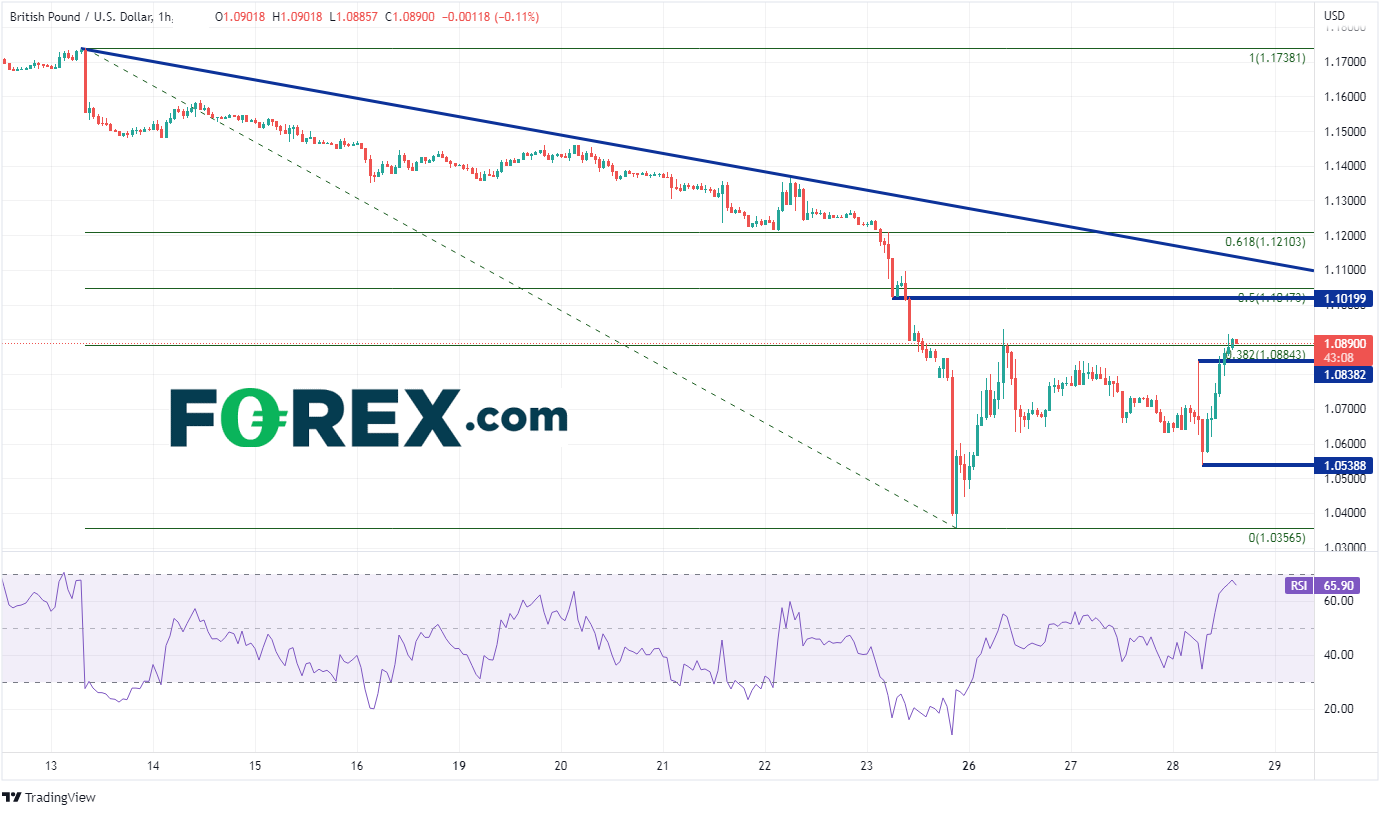 英镑/美元在两周多以前的9月13日,盘中最高到达1.1738,自那以后大举下破。上周五开盘报在1.1252,到周一之前已跌至历史低点1.0357,随后回升至9月13日高点到周一低点行情的38.2%回档位(1.0931附近)上方不远处, 此后徘徊于1.0650 - 1.0800区间,直到今天。在英国央行宣布购买国债时,英镑/美元反弹200点子,至1.0848。之后在交易员消化了新信息后回落至1.0539。周三收盘时,英镑/美元交投于日内高点1.0915附近。