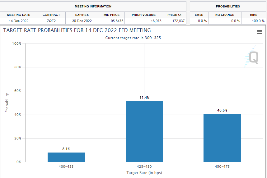 芝商所FedWatch工具显示,鉴于FOMC的11月议息会议将继续加息75个基点,12月维持75个基点的可能性增加至40%,不过加息50个基点的可能性仍高达50%。
