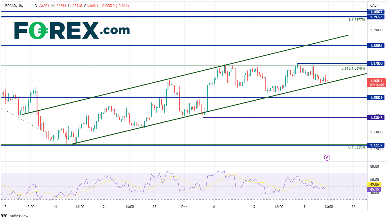 4小时图内,美元/加元上个月上升,但近期陷入波动,试图突破上文提到的61.8%回档位。不过货币对从11月中以来一直维持上升通道。如果货币继续攀升,第一道阻力位将落在12月16日高点1.3705。由此向上,货币对将向11月3日高点1.3808进发,最后再在上行通道上轨的1.3840附近遇阻。美元/加元目前交投价位于通道下轨附近。如果货币对继续下跌,第一个支撑位落在头肩形态的颈线位置,靠近1.3502。由此向下,第二个支撑位位于12月4日低点1.3390,继续下探还能在11月16日低点1.3690附近找到最后的支撑位。