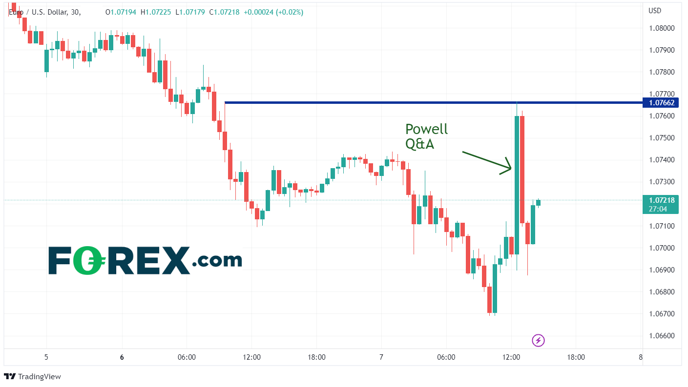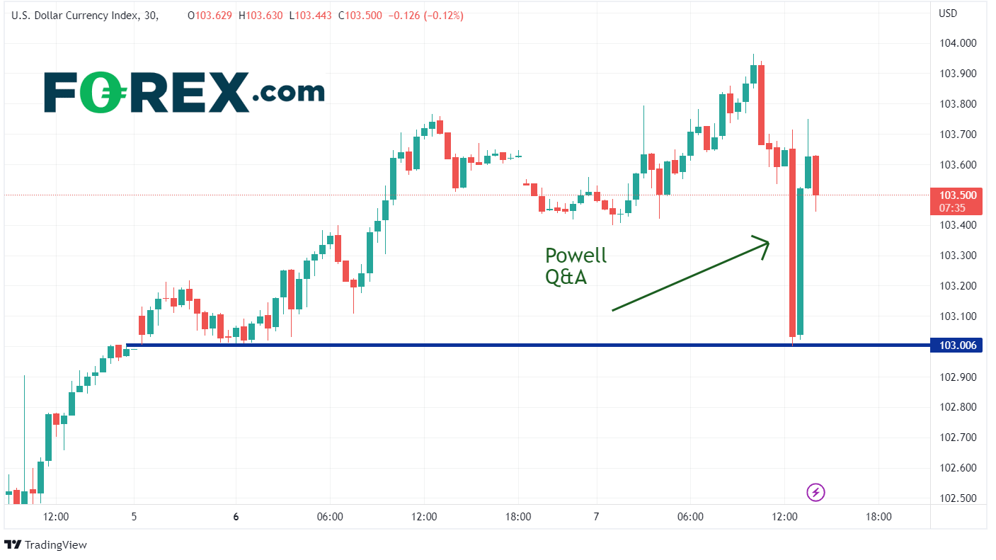 美元指数最初遭到抛售,因为鲍威尔坚称反通货膨胀进程已开始。市场视此为鸽派论调(就像上周FOMC会议后的新闻发布会一样)。请注意,DXY一度跌至上周末之后的跳空缺口和支撑位。然而,当确认非农报告对美联储的未来行动没有任何影响后,DXY回升至鲍威尔开始讲话时的同一点位。总的来说,DXY在30分钟内从103.65下跌到103.00,然后在接下来的1小时内反转走势并一路反弹至原点(甚至更多)。