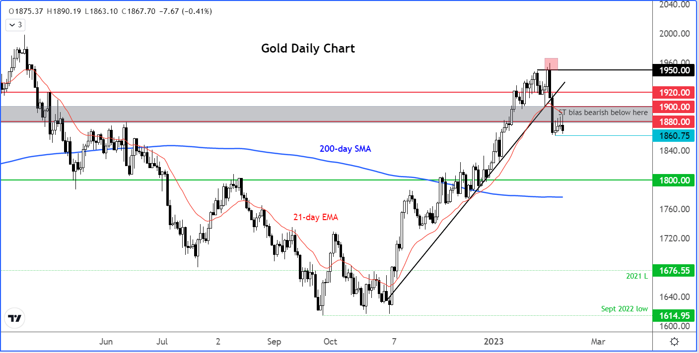 黄金最近几天通过盘整消化了许多利好美元的消息。然而,它还没有显示出任何复苏的迹象。多头需要观察它能否在日线图上形成关键的反转形态,理想情况是在当前点位附近形成反转。看涨锤形K线和高于1880美元的收盘价将是不错的起步。在看到反转之前,多头必须保持耐心。