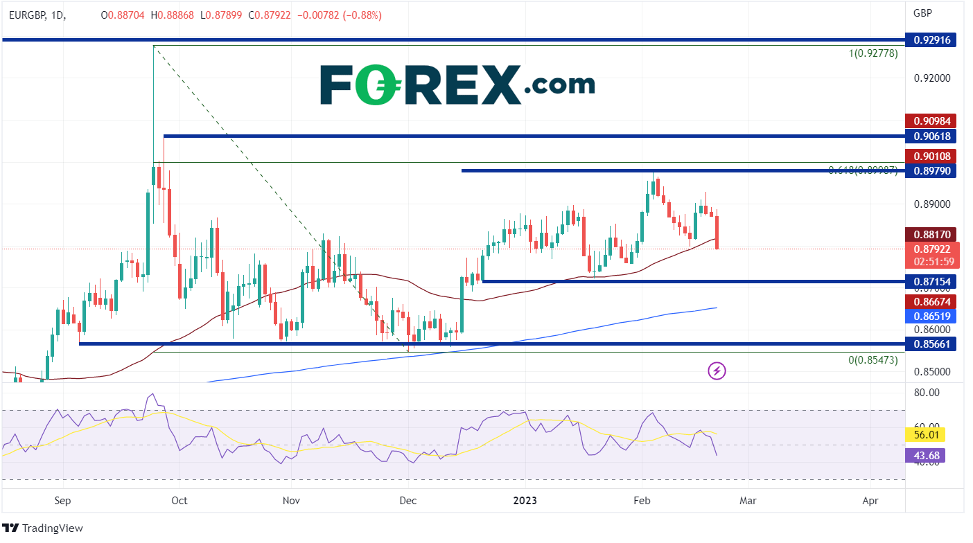 2022年9月26日,欧元/英镑涨至2020年9月以来的最高水平,接近0.9278,因为前首相利兹·特拉斯的预算计划让市场陷入恐慌。在接下来的几天里,秩序恢复,到2022年12月1日,欧元兑英镑创下了低点0.8547。此后,该货币对反弹至2022年9月26日高点到2022年12月1日低点区间的61.8%斐波那契回撤位0.8999附近。然而,自12月下旬以来,欧元/英镑仅交投于0.8715和0.8979之间。随着今天英镑的强势崛起,该货币对正在经历自1月17日以来的最大单日抛售,盘中下跌-0.88%。请注意,今天的价格自2022年12月15日以来首次跌破50日移动平均线。