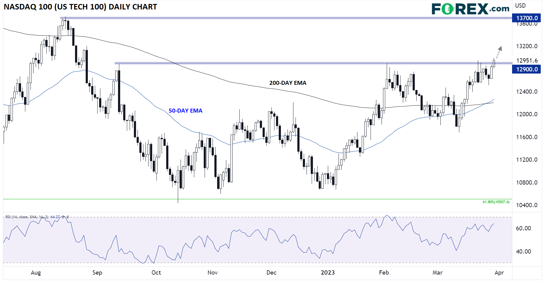 如上图所示,纳斯达克100指数正在突破之前的强阻力位12,900区域。本周早些时候,该指数的50日均线上穿200日均线形成 “金叉”,表明转向长期看涨趋势。