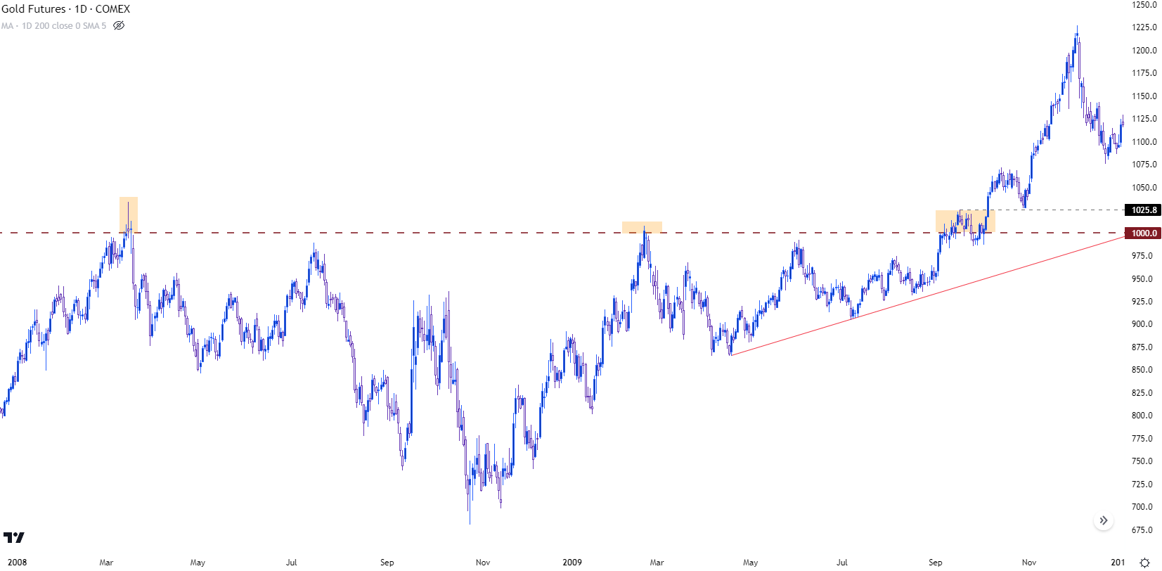 如果我们回顾一下黄金在2008年遭遇1k点位时的表现,就会发现这有点类似于猫捉老鼠的游戏,因为在金融危机期间,金价出现34%的回调之前,有两次日线收盘价高于该点位。