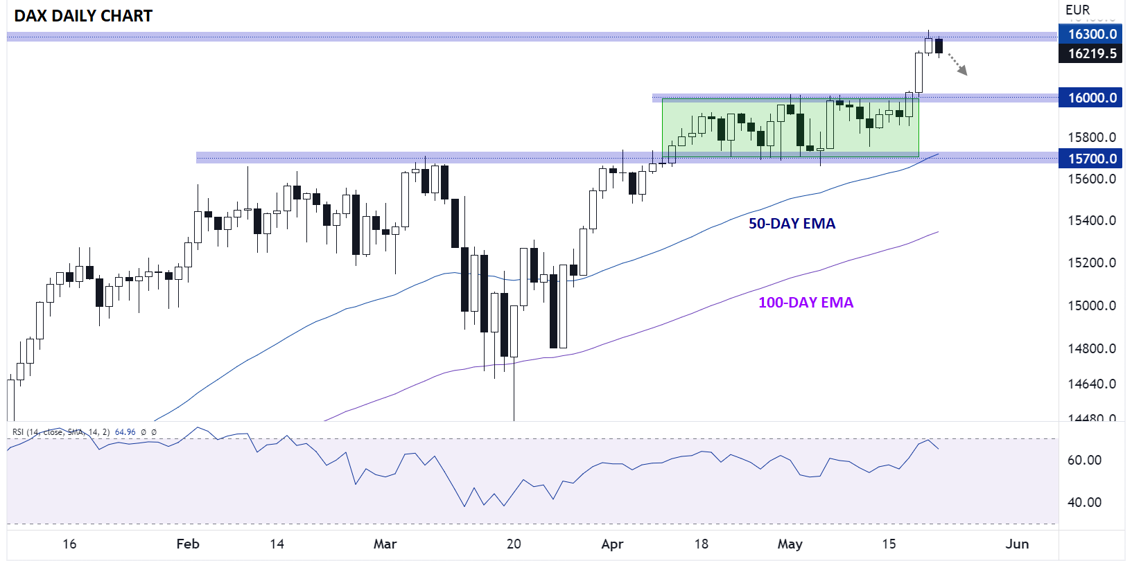 随着欧元区PMI、美联储会议纪要、核心PCE和美国债务上限谈判的进行,驱动欧元/美元和DAX指数波动的因素很多,但从纯粹的技术角度来看,交易员大概率会面临上周大幅走势以后的一些回调。