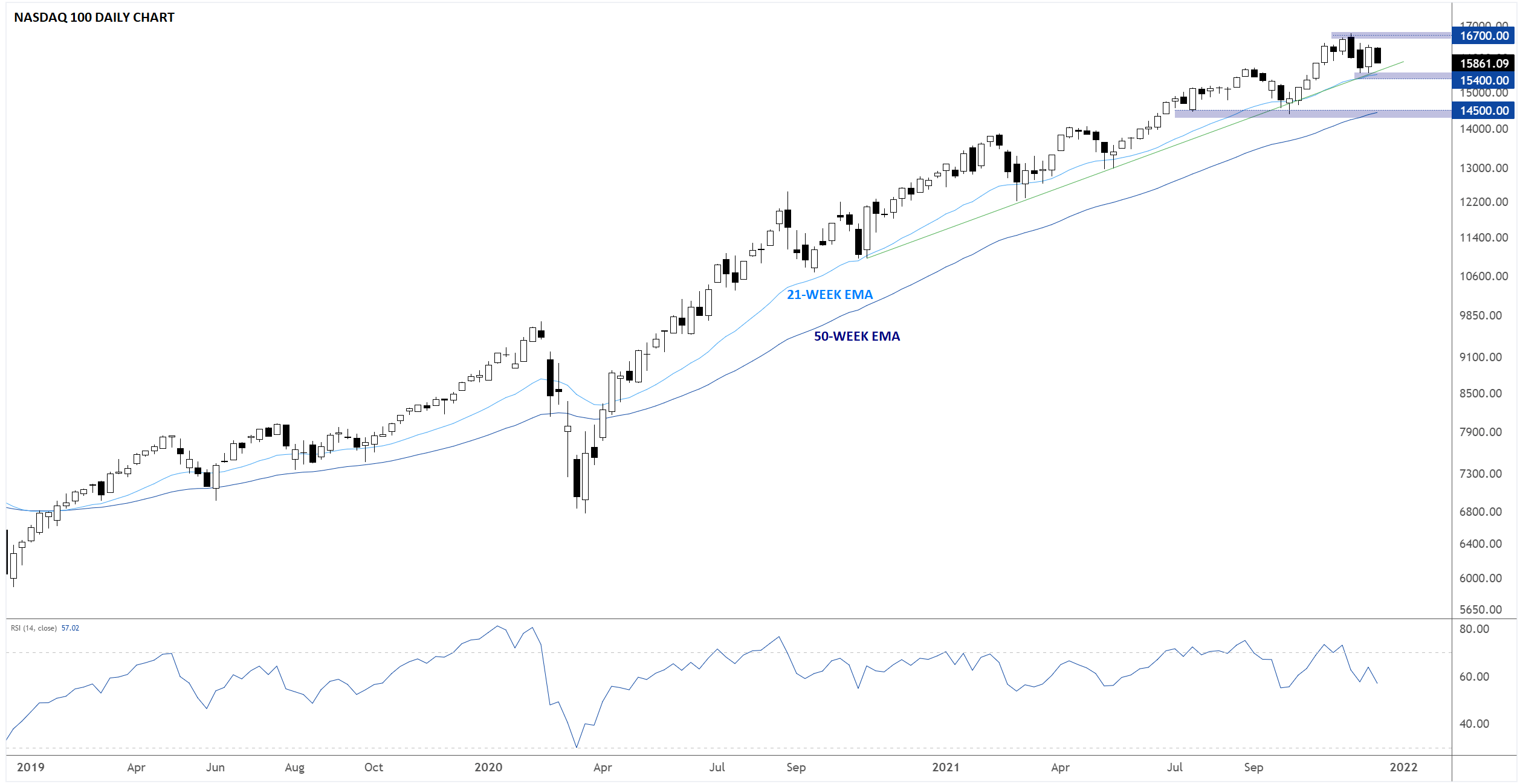 科技股密集的股指纳斯达克100指数的图表的样子和标普500指数相似:价格在牢固的上涨通道内走高,过去18个月交易者不断在其下探21周指数移动均线后逢低买入。纳斯达克100指数在年初需要重点关注的价位是15400附近,如果下破,可能下看14500。只有确认突破14500,才有可能质疑较长期上涨趋势。上档方面,如果可以攻克2021年高点16700,多头可能剑指18000以上水平: