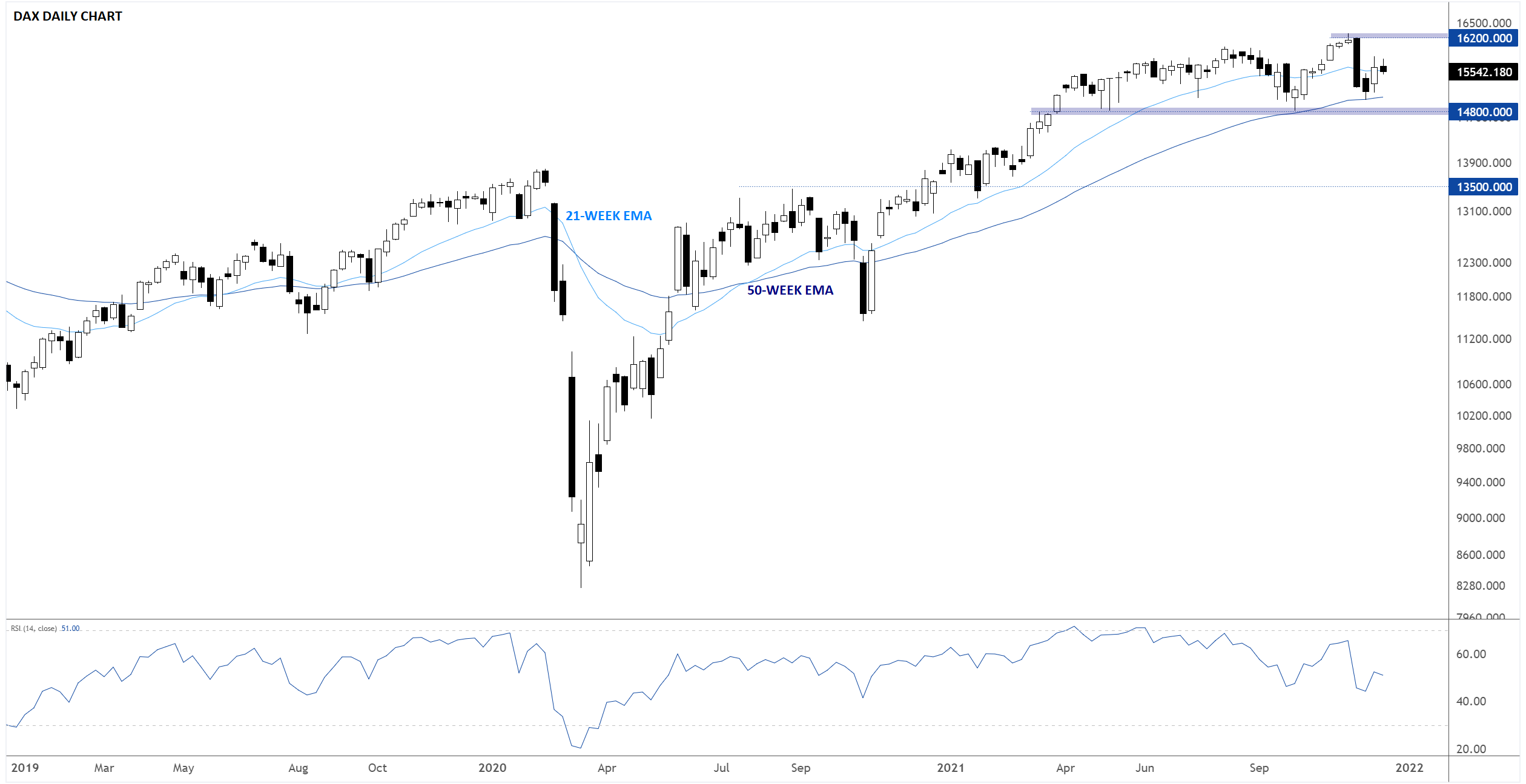 将目光投到大西洋对岸的德国,我们发现其交易广泛的DAX指数在2021年表现落后于美国股指,过去三个季度更多的是横盘,而没有走出明确的趋势。如果2022年全球股指受挫,本就落后的DAX40指数可能更易遭到抛售。年初的关键支撑位在14800区域,如果突破,合乎逻辑的支撑位可能要到13500附近,那是2020年下半年的阻力位,也是2021年年初以来的支撑位。而如果出现确认站上16200这一更为看涨的情境,可能打开持续上涨的空间,后市摸至17000上方历史高点区域: