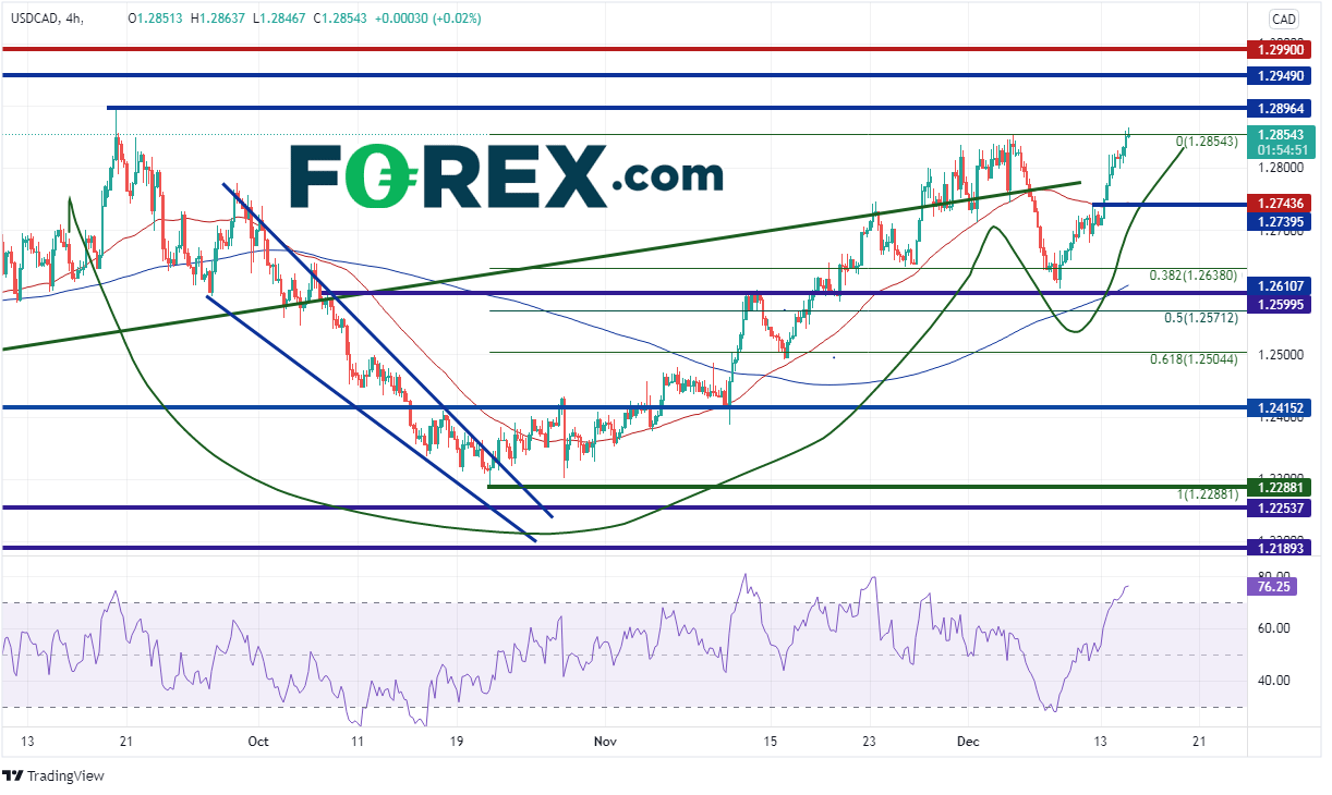 美元/加元方面随着加拿大央行会议落幕,现在只剩美元这个关注因素。美联储将于周三召开货币政策会议。美元指数得到买盘青睐,帮助提振美元/加元,使其周二收于2021年最高点,即1.2855附近,也打破了杯柄形态。上方有三个水平阻力位,包括前高点1.2896、2021年高点1.2949和长期水平阻力位1.2990。水平支撑位与50天均线在1.2740附近、12月8日低点和水平支撑位在1.2600/1.2610附近。