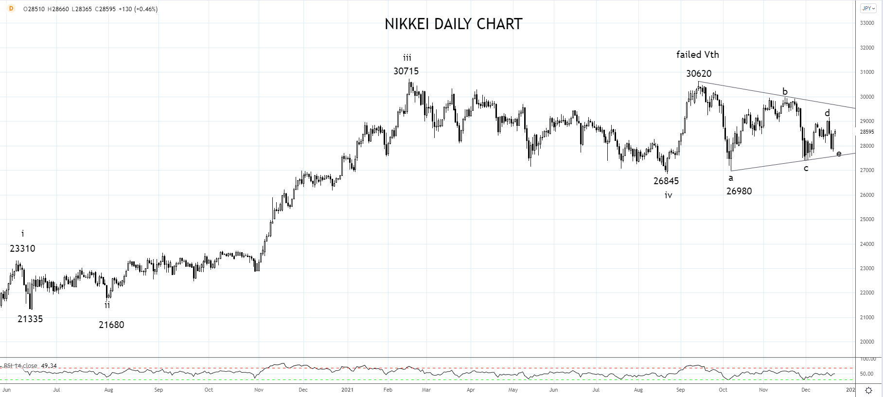如下图所示,日经指数完成自2020年3月15680至9月30620高点的五浪推高后,在2021年最后三个月展开回调。此次三角五浪调整行情似乎于周一27745低点结束。