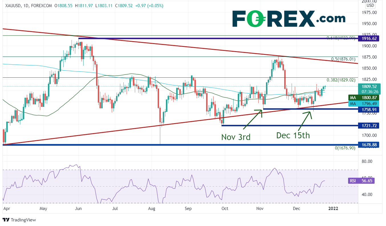 把进度条快进到今天我们发现,标普500指数相较其2020年低点已经翻了一番。2021年对产品与服务的需求回暖,造成供应跟不上,并带来通胀。美国FOMC在12月15日宣布,将于2022年3月结束量化宽松,而且FOMC成员预测2022年和2023年各有三次加息。交易者现在必须思考:随着各国央行减少货币供应,投资者何时将撤出股市?在供应端受制且通胀上升的背景下,投资者何时将进入黄金以及其它贵金属等避险资产?会是在2022年年初吗?