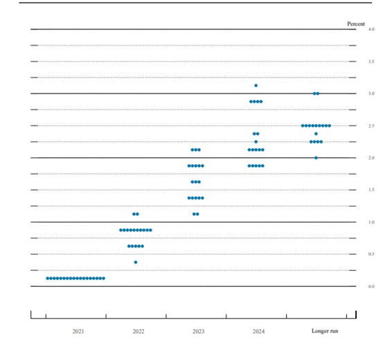12月FOMC会议的记录透露出比市场之前预期更加强硬的信息。从下图的点阵图(于12月中旬会议当晚发布)看,美国年内将加息三次,而且记录呈现的官员评论表明,对首次加息的中值预期值从2023年3月前移至2022年6月。这点与12月会议后发布的声明一致。FOMC评论也指出,“对较长期联邦基金利率的预期值一直没有上升”,而且“FOMC对所有基金利率的各项调查得出的结果大相径庭,所以,联邦基金利率前景不明”。
