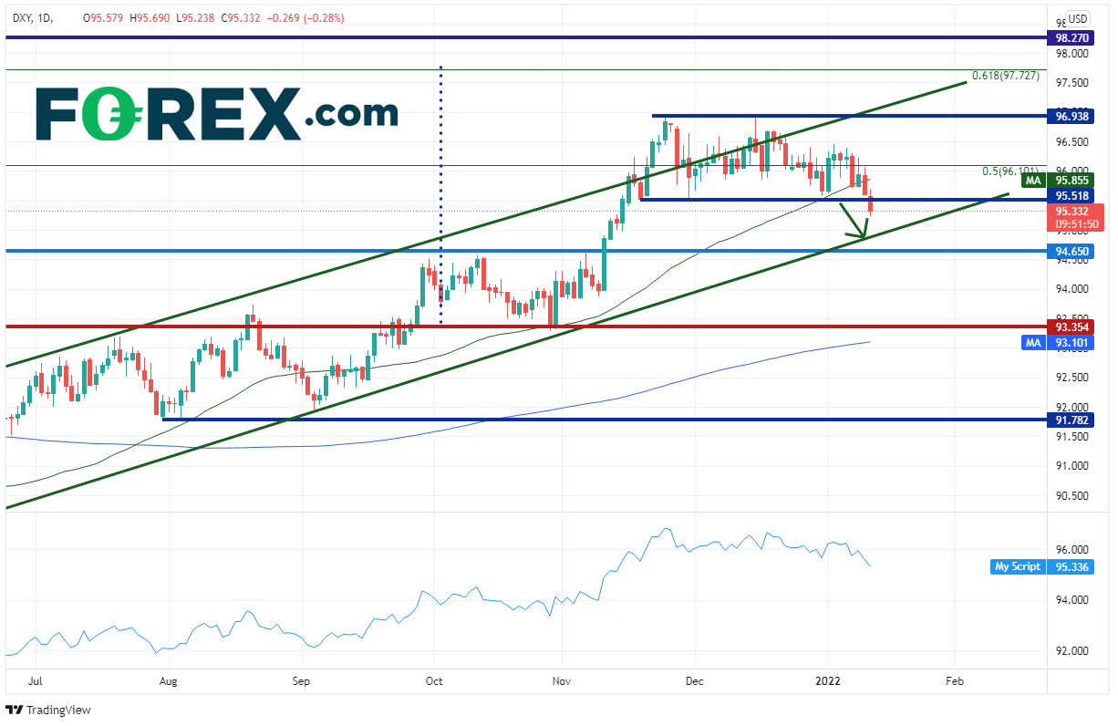 在CPI数据公布之前,市场充分计入了报在7%的可能性。所以,市场面临的风险是最终读数低于7%而不是高于7%。美元遭遇“听传闻买进见事实沽出”,在CPI数据发布后旋即下跌。但距离反转还有多少下跌空间呢?美元指数终于下破2021年11月中旬以来的水平区间,即95.50 - 97.00,但把时间放长到2021年5月则一直处于长期上升通道内。请留意美元指数考验通道下轨趋势线所在的94.90附近的可能性。下档支撑位先后落在水平支撑位95.65、93.35。上档阻力位有50天均线95.85附近、近期区间上轨96.94/97.00和通道上轨97.15附近。