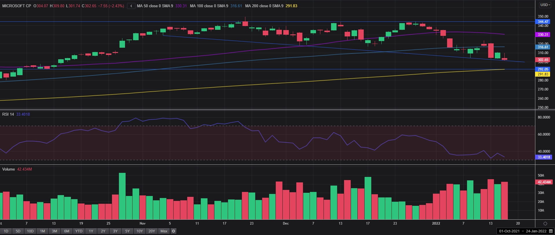 股价在过去两周,包括昨天都走出长上影线,表明多头力有不逮,即看跌趋势可能延续,这点也得到了看跌RSI的支持。而且,2022年初以来的成交量相较去年一直高于平均水平。市场变动伴随着成交量放出巨量预示着大多数交易者正在卖出股票,意即微软股价当前趋势继续下去的几率较高。