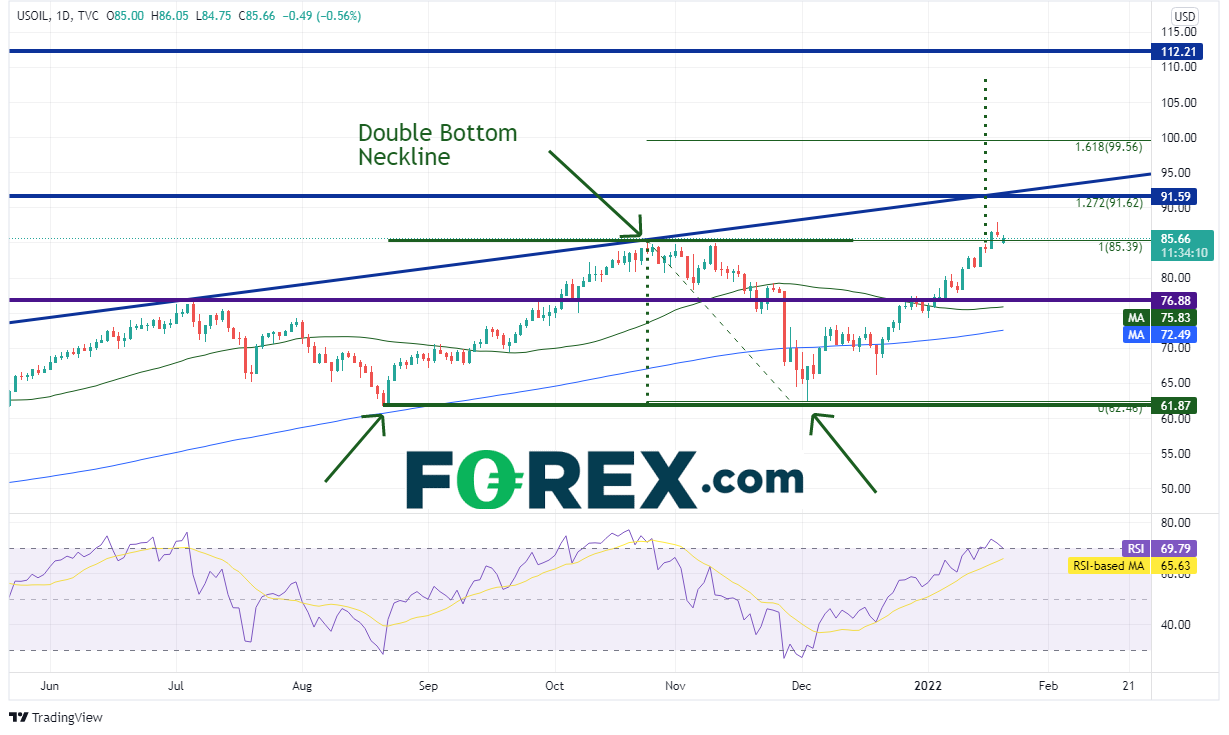 西得州原油和布伦特原油双双创下2014年以来最高点,后市能够在需求旺盛、OPEC+部分成员国供应不力的支持下继续走高吗?从突破双底形态的颈线判断,两者都有机会延续涨势。