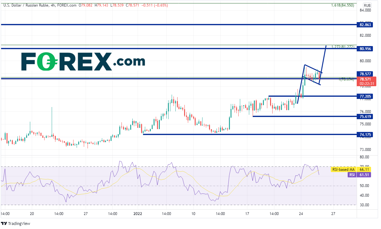 如果有关俄罗斯入侵乌克兰方面继续传出负面消息,可能更加有力地推动美元/俄罗斯卢布上涨。该货币对日图完成旗形后4小时图似乎在构筑新的旗形形态,请留意该形态目标80.20。
