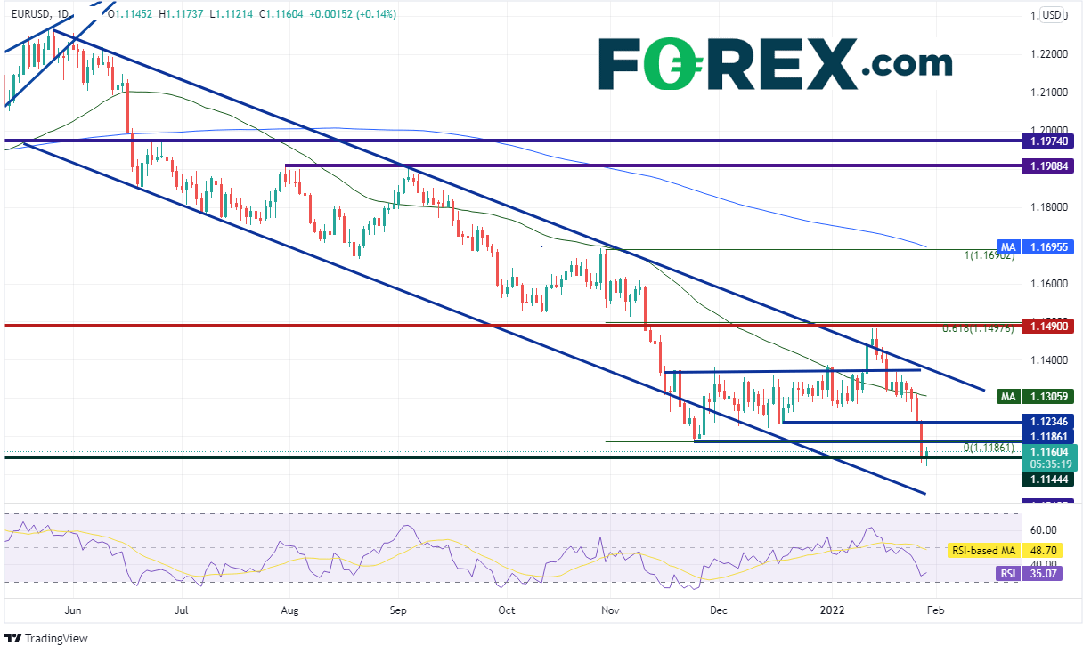 2021年5月以来,欧元/美元一直有序下跌,形成下降通道。继2021年11月24日假性下破通道至1.1186之后,该货币对又回到前述通道内。欧元/美元窄幅交投,直至1月12日假性上破该通道上轨,至1.1490附近。该货币对随后回到通道内且加速下滑,攻克11月以来低点1.1186,近期考验2020年3月以来支撑位1.1144附近。
