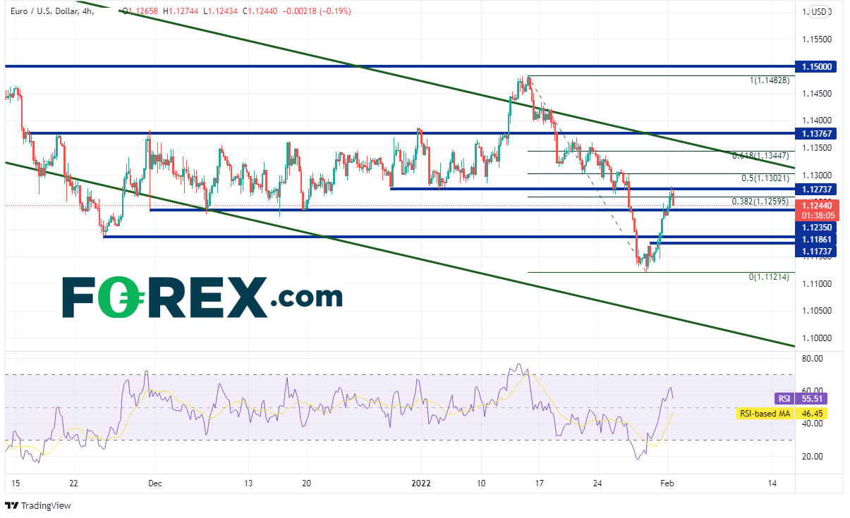 欧元/美元4小时图的水平阻力位就在当前价位上方不远处的1.1274,接下来50天均线与1月14日高点到1月28日低点行情的50%回档位相汇的1.1302/1.1305附近、前述行情的61.8%回档位1.1345附近,先后构成阻力。下档支撑位有1.1173下方的水平支撑、近期低点1.1121。如果攻破,下看1.1105,即2021年11月24日低点到2022年1月14日高点行情的127.2%扩展位。