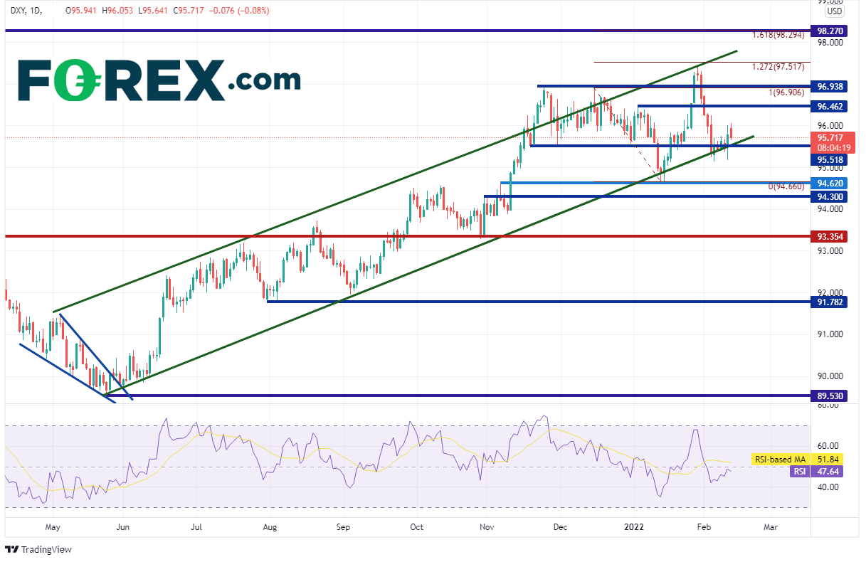 美元指数2021年5月以来一直交投于一个上涨通道内。2021年11月价格一度向上突破通道,最高达到98.91,只是随后回落至通道内并在1月12日考验通道下轨所在的94.66附近。美元指数之后再度摸至2021年11月高点到1月12日低点95.54附近行情的127.2%扩展位,该位也是通道上轨趋势线所在。价格形成黄昏之星后回到通道的下轨趋势线,目前就落在该趋势线所在的95.50附近上方不远处。