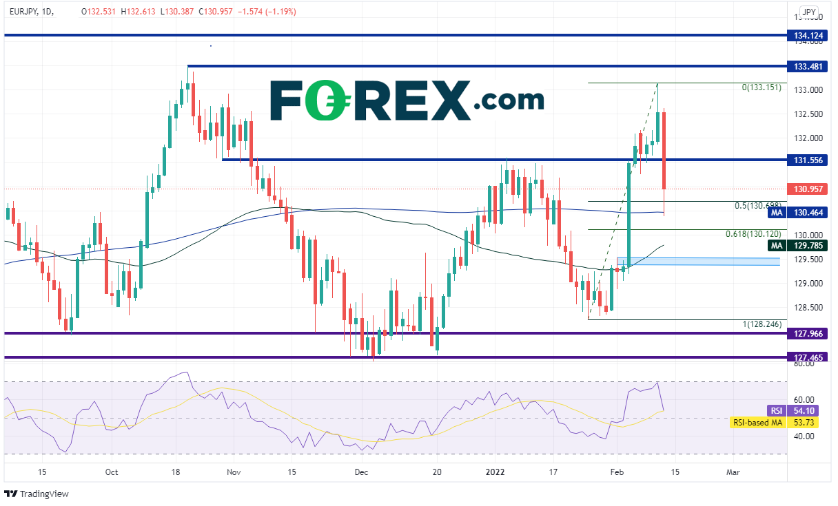 上周在白宫言论发布后,市场初步呈现上述走势。欧元/日元自132.00上方跌至200天均线130.39。如果入侵的威胁不消除,欧元/日元可能跌至1月27日低点到2月10日高点行情的61.8%回档位,然后下看50天均线129.79、129.34-129.53支撑区间以及1月25日以来低点128.20。