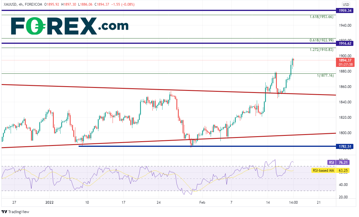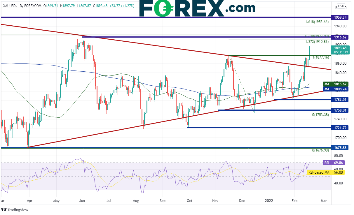 我的同事Matt Weller在FOMC会议记录发布之后撰文阐述了黄金(现货黄金/美元)如何基于宏观经济形势(即高企通胀与加息环境)走高,但黄金今天的走势似乎更多地基于俄乌危机而非长期宏观背景。