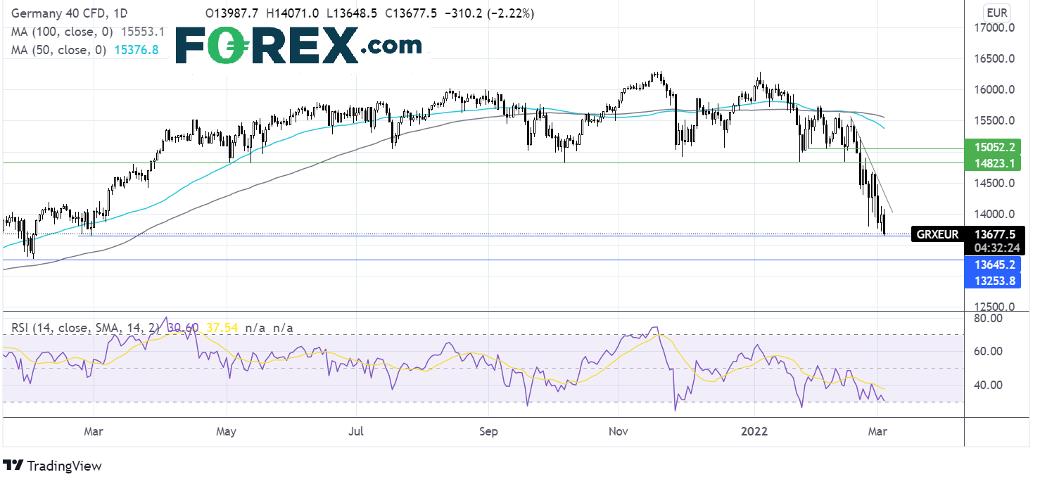 DAX今天跌至2021年2月低点13650,此文发稿时守住了支撑位。但如果失守,股指可能跌至2021年低点13250。