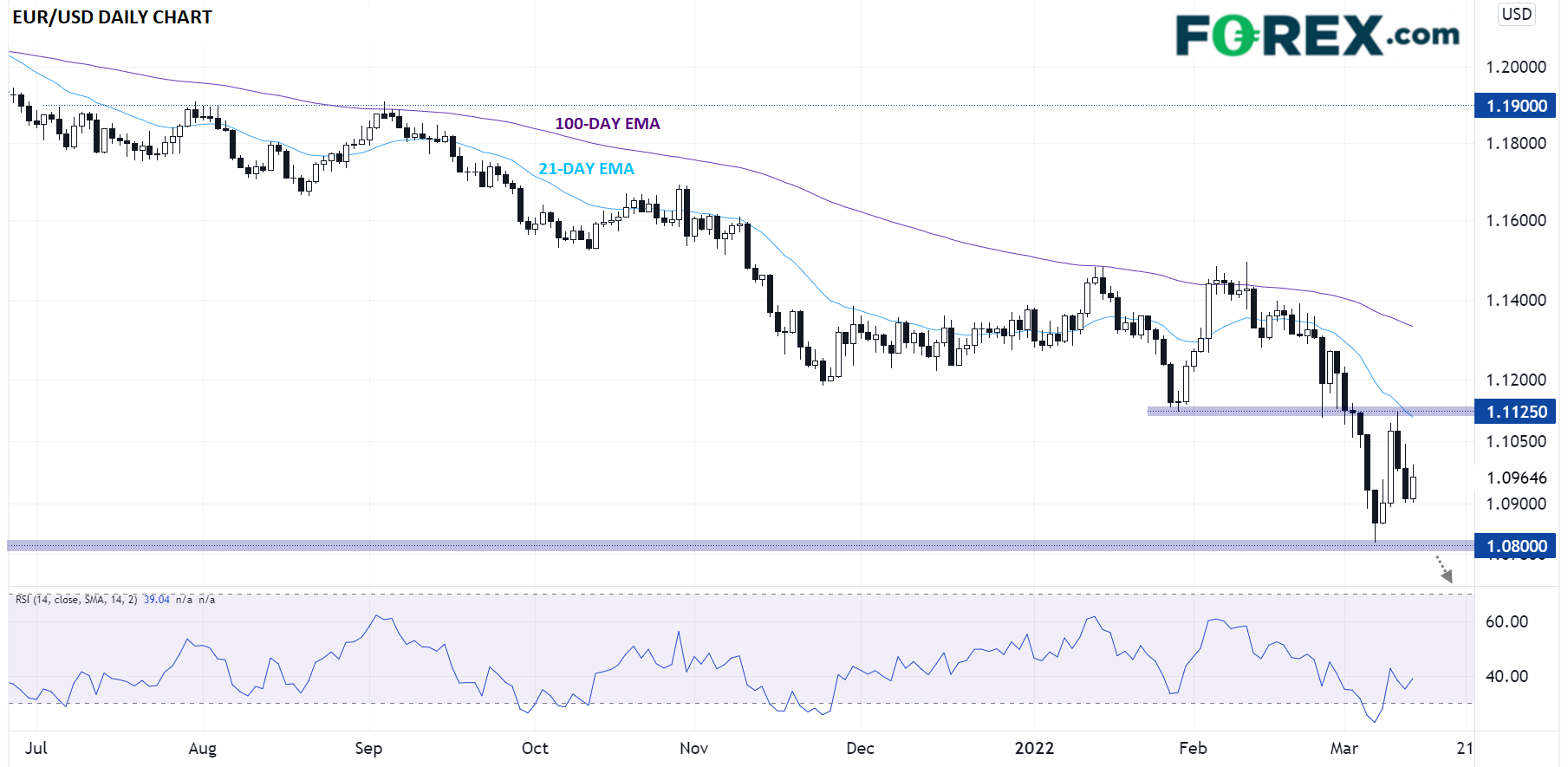 如下图所示,欧元/美元上周在前支撑位现阻力位1.1125附近调头向下,本周需要重点关注的支撑位在上周低点1.0800附近。如果攻克该位,可能下看1.0600一线中轨的5年低点: