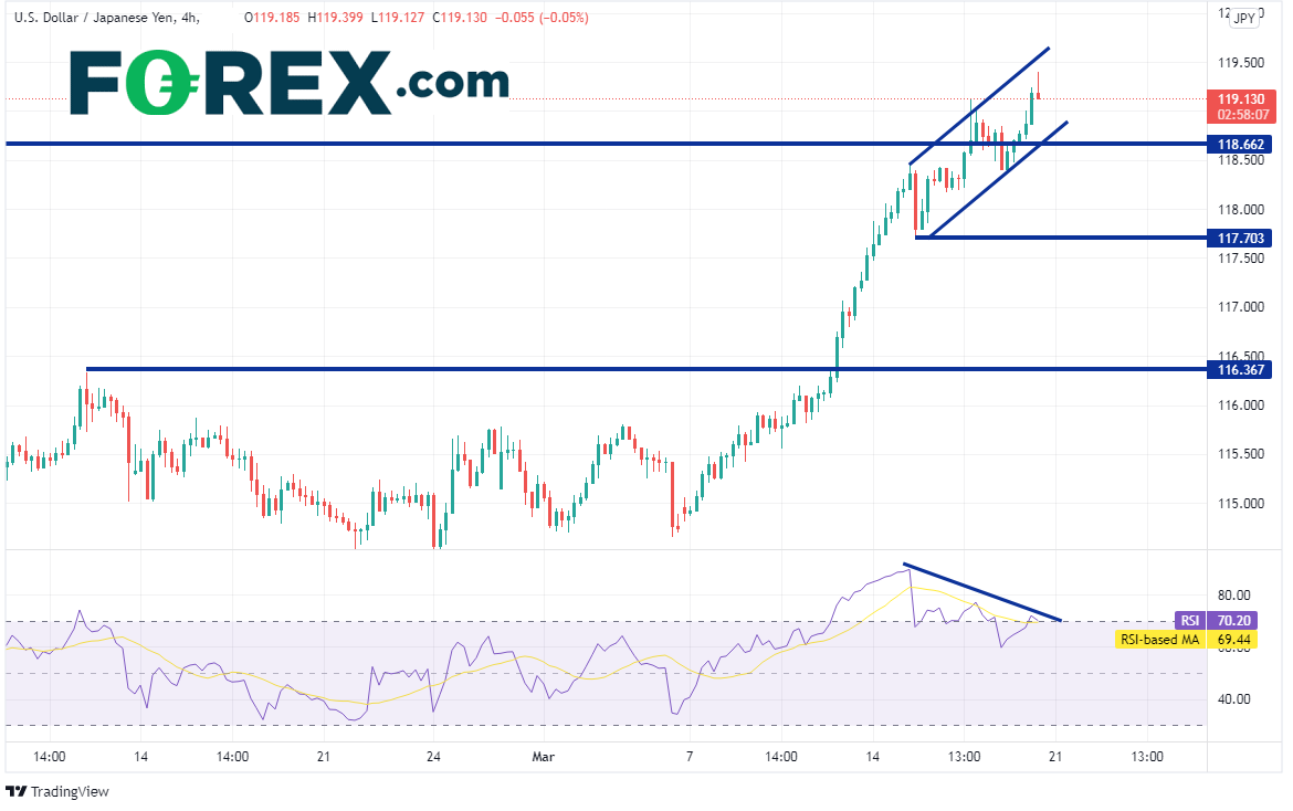 美元/日元4小时图自3月15日以来再度调头向上并形成上升通道,但RSI和日图一样超买且与价格背离,而且是价格出现3个上抬的高点和RSI出现3个下降的高点,更加强烈地暗示价格或准备回调。第一支撑位在118.66,由通道下轨趋势线和近期新高突破位组成,然后是3月15日低点117.70以及水平支撑位116.37。